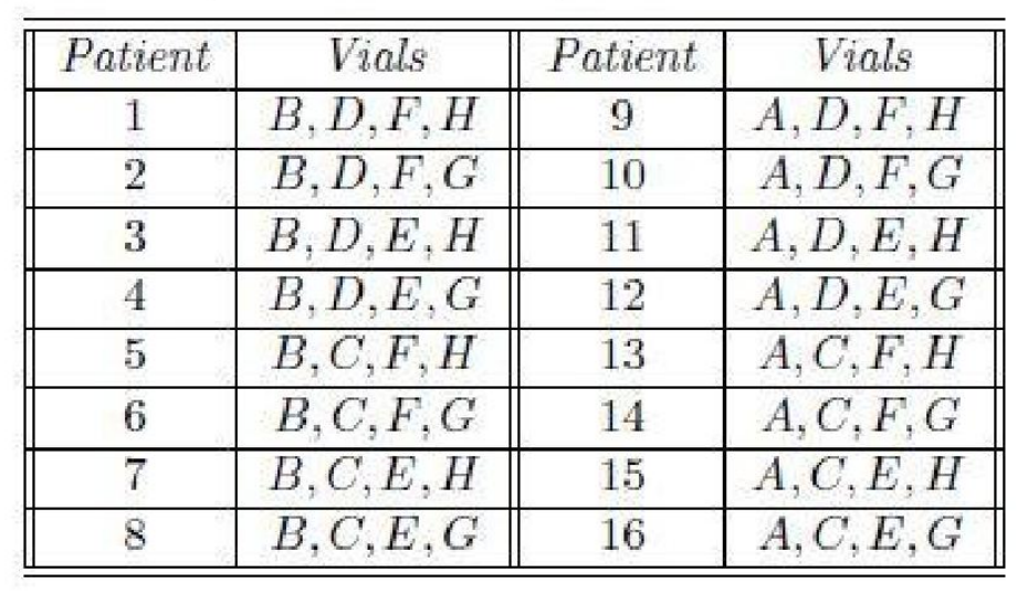 The patients are numbered 1 through 16, and the vials are labelled A, B, C, D, E, F, G, and H. The following table shows the vials into which each patient's blood sample is distributed. If a patient has the disease, then each vial containing his/her blood sample will test positive. If a vial tests positive, one of the patients whose blood samples were mixed in the vial has the disease. If a vial tests negative, then none of the patients whose blood samples were mixed in the vial has the disease.\