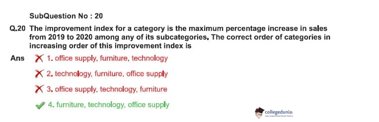 The improvement index for a category is the maximum percentage increase in sales from 2019 to 2020 among any of its subcategories. The correct order of categories in increasing order of this improvement index is: