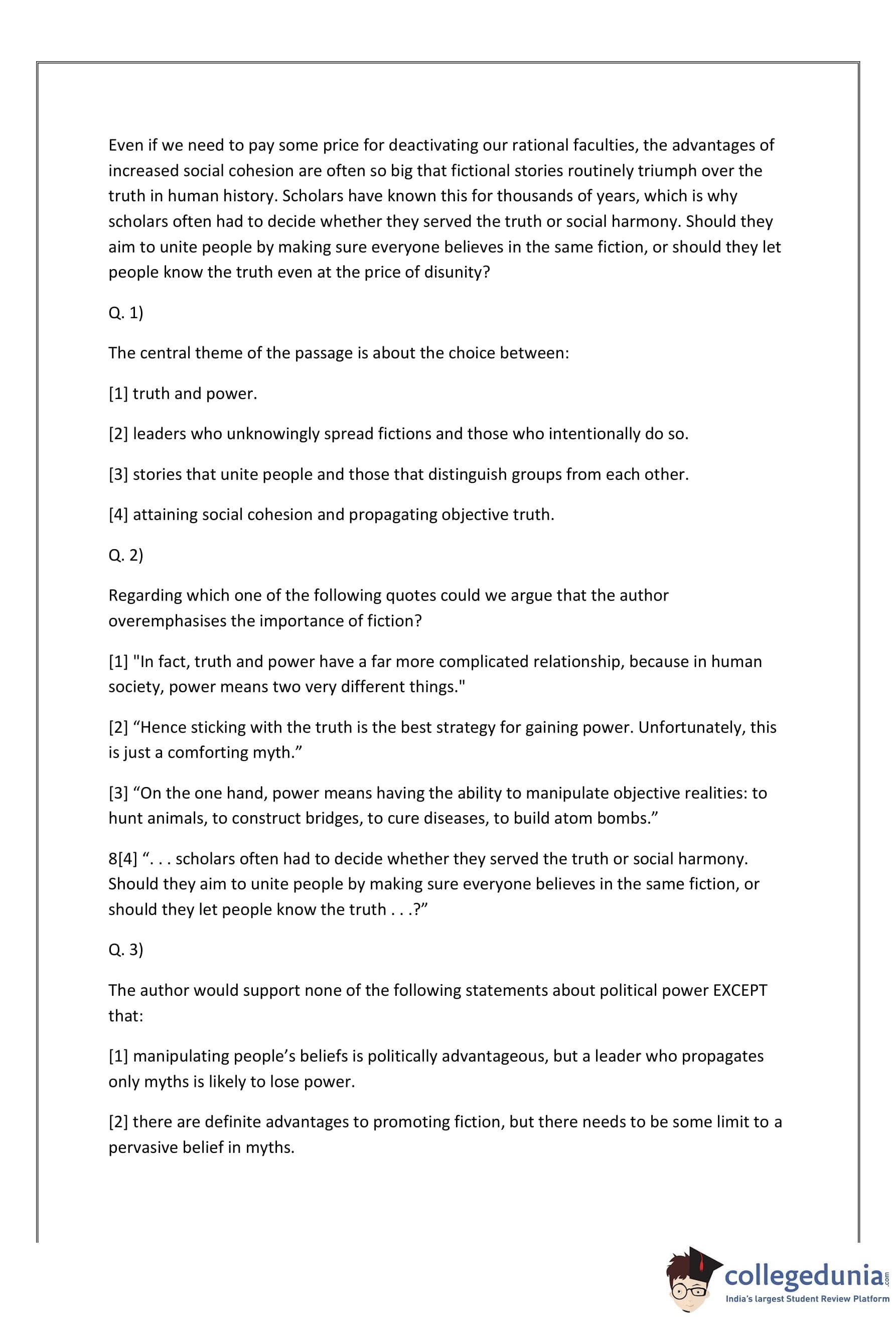 he passages given here are followed by some questions that have four answer choices; read the passage carefully and pick the option whose answer best aligns with the passage. Many people believe that truth conveys power. . . . Hence sticking with the truth is the best strategy for gaining power. Unfortunately, this is just a comforting myth. In fact, truth and power have a far more complicated relationship, because in human society, power means two very different things.