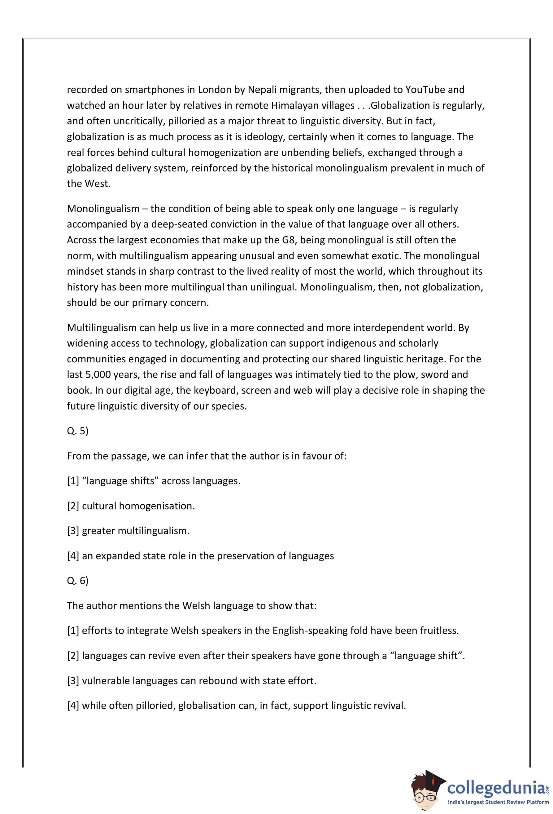 Thus, the correct option is: \[ \boxed{(3) greater multilingualism.} \] Quick Tip: Look for the emphasis in the passage on the advantages of multilingualism and its connection to globalization.