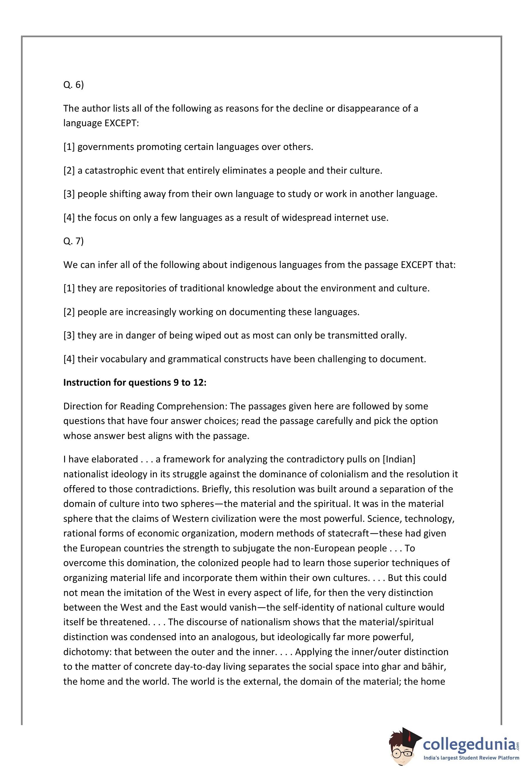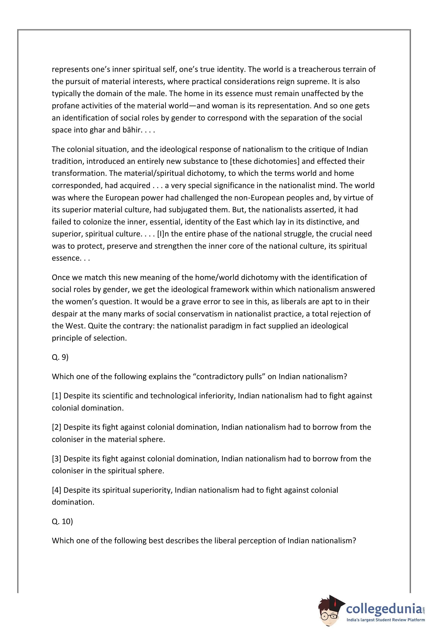 It was in the material sphere that the claims of Western civilization were the most powerful. Science, technology, rational forms of economic organization, modern methods of statecraft-these had given the European coun- tries the strength to subjugate the non-European people . . . To overcome this domination, the colonized people had to learn those superior techniques of organizing material life and 10 incorporate them within their own cultures. . . . But this could not mean the imitation of the West in every aspect of life, for then the very distinction between the West and the East would vanish-the self-identity of national culture would itself be threatened. . . . The discourse of nationalism shows that the material/spiritual distinction was condensed into an analogous, but ideologically far more powerful, dichotomy: that between the outer and the inner. . . . Apply- ing the inner/outer distinction to the matter of concrete day-to-day living separates the social space into ghar and bahir, the home and the world. The world is the external, the domain of the material; the home represents one’s inner spiritual self, one’s true identity. The world is a treacherous terrain of the pursuit of material interests, where practical considerations reign supreme. It is also typically the domain of the male. The home in its essence must remain unaffected by the profane activities of the material world-and woman is its representation. And so one gets an identification of social roles by gender to correspond with the separation of the social space into ghar and b¯ahir .. . . The colonial situation, and the ideological response of nationalism to the critique of In- dian tradition, introduced an entirely new substance to [these dichotomies] and effected their transformation. The material/spiritual dichotomy, to which the terms world and home corre- sponded, had acquired . . . a very special significance in the nationalist mind. The world was where the European power had challenged the non-European peoples and, by virtue of its superior material culture, had subjugated them. But, the nationalists asserted, it had failed to colonize the inner, essential, identity of the East which lay in its distinctive, and superior, spiritual culture. . .. [I]n the entire phase of the national struggle, the crucial need was to protect, preserve and strengthen the inner core of the national culture, its spiritual essence .. . Once we match this new meaning of the home/world dichotomy with the identification of social roles by gender, we get the ideological framework within which nationalism answered the women’s question. It would be a grave error to see in this, as liberals are apt to in their despair at the many marks of social conservatism in nationalist practice, a total rejection of the West. Quite the contrary: the nationalist paradigm in fact supplied an ideological principle of selection.The passages given here are followed by some questions that have four answer choices; read the passage carefully and pick the option whose answer best aligns with the passage. I have elaborated . . . a framework for analyzing the contradictory pulls on [Indian] nation- alist ideology in its struggle against the dominance of colonialism and the resolution it offered to those contradictions. Briefly, this resolution was built around a separation of the domain of culture into two spheres-the material and the spiritual. It was in the material sphere that the claims of Western civilization were the most powerful. Science, technology, rational forms of economic organization, modern methods of statecraft-these had given the European coun- tries the strength to subjugate the non-European people . . . To overcome this domination, the colonized people had to learn those superior techniques of organizing material life and 10 incorporate them within their own cultures. . . . But this could not mean the imitation of the West in every aspect of life, for then the very distinction between the West and the East would vanish-the self-identity of national culture would itself be threatened. . . . The discourse of nationalism shows that the material/spiritual distinction was condensed into an analogous, but ideologically far more powerful, dichotomy: that between the outer and the inner. . . . Apply- ing the inner/outer distinction to the matter of concrete day-to-day living separates the social space into ghar and bahir, the home and the world. The world is the external, the domain of the material; the home represents one’s inner spiritual self, one’s true identity. The world is a treacherous terrain of the pursuit of material interests, where practical considerations reign supreme. It is also typically the domain of the male. The home in its essence must remain unaffected by the profane activities of the material world-and woman is its representation. And so one gets an identification of social roles by gender to correspond with the separation of the social space into ghar and b¯ahir .. . . The colonial situation, and the ideological response of nationalism to the critique of In- dian tradition, introduced an entirely new substance to [these dichotomies] and effected their transformation. The material/spiritual dichotomy, to which the terms world and home corre- sponded, had acquired . . . a very special significance in the nationalist mind. The world was where the European power had challenged the non-European peoples and, by virtue of its superior material culture, had subjugated them. But, the nationalists asserted, it had failed to colonize the inner, essential, identity of the East which lay in its distinctive, and superior, spiritual culture. . .. [I]n the entire phase of the national struggle, the crucial need was to protect, preserve and strengthen the inner core of the national culture, its spiritual essence .. . Once we match this new meaning of the home/world dichotomy with the identification of social roles by gender, we g