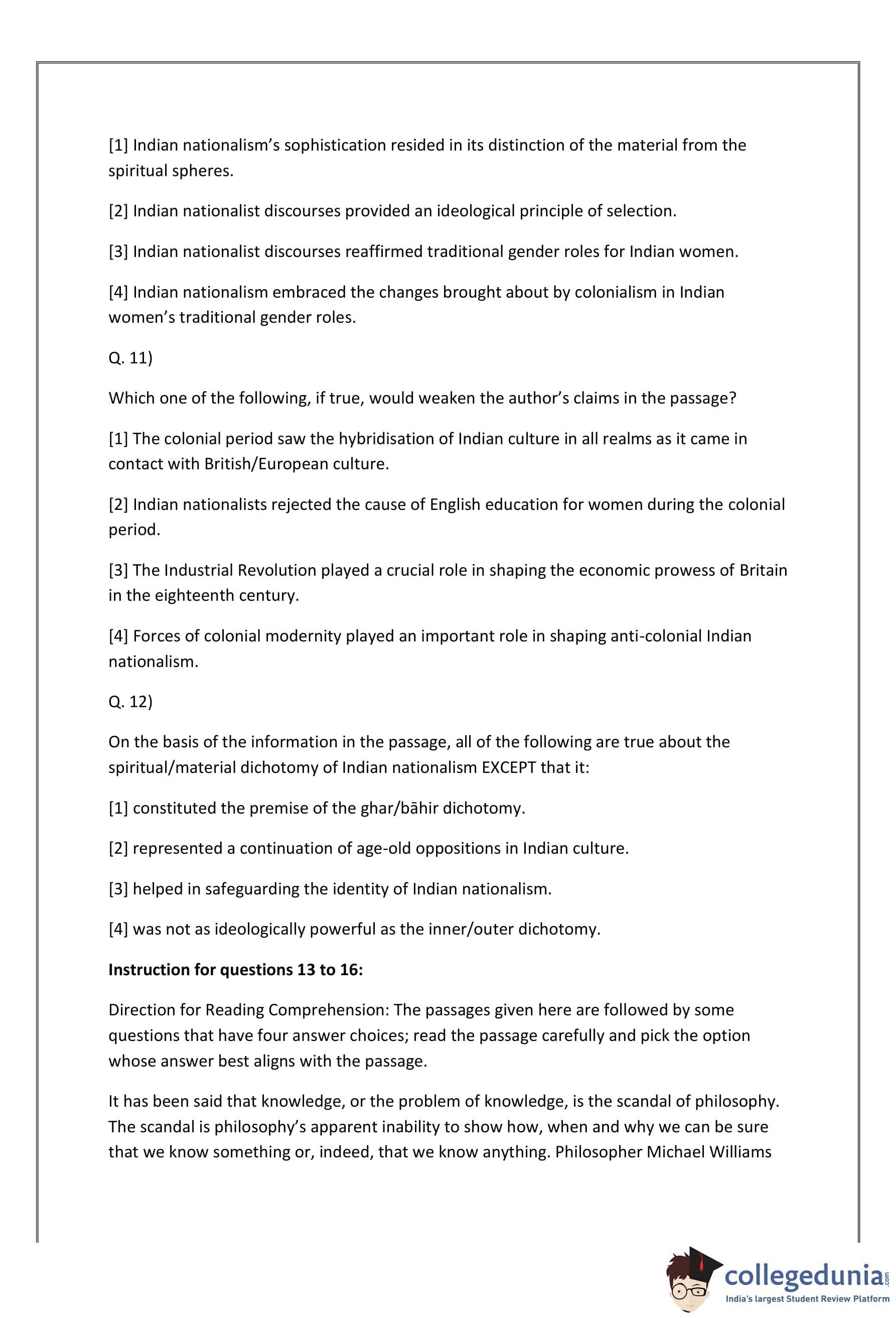Thus, the correct option is: \[ \boxed{(2) Despite its fight against colonial domination, Indian nationalism had to borrow from the coloniser in the material sphere.} \] Quick Tip: Focus on the contradiction where Indian nationalism had to incorporate Western techniques in the material sphere while maintaining its spiritual distinctiveness.