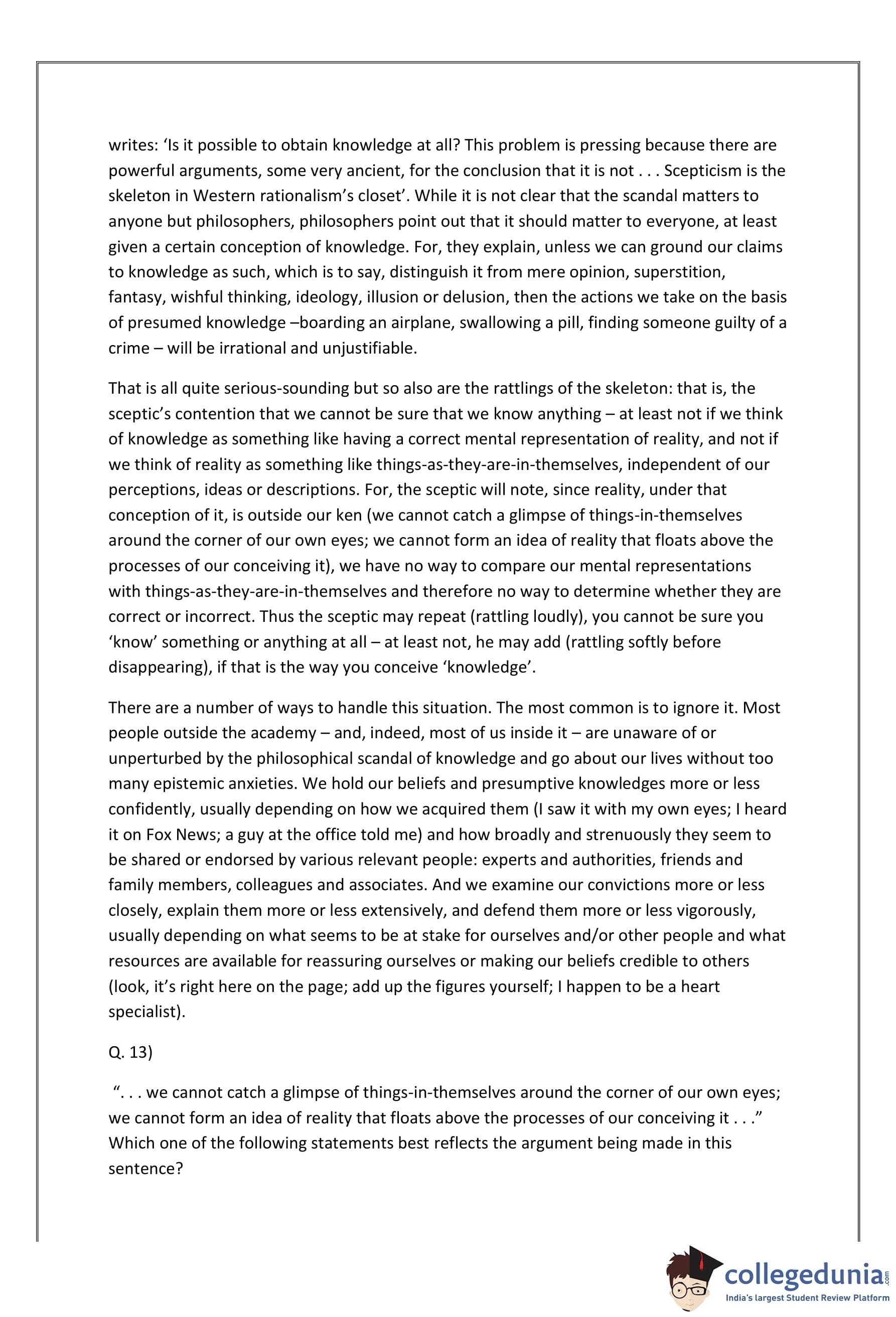 The passages given here are followed by some questions that have four answer choices; read the passage carefully and pick the option whose answer best aligns with the passage. It has been said that knowledge, or the problem of knowledge, is the scandal of philosophy. The scandal is philosophy’s apparent inability to show how, when and why we can be sure that we know something or, indeed, that we know anything.