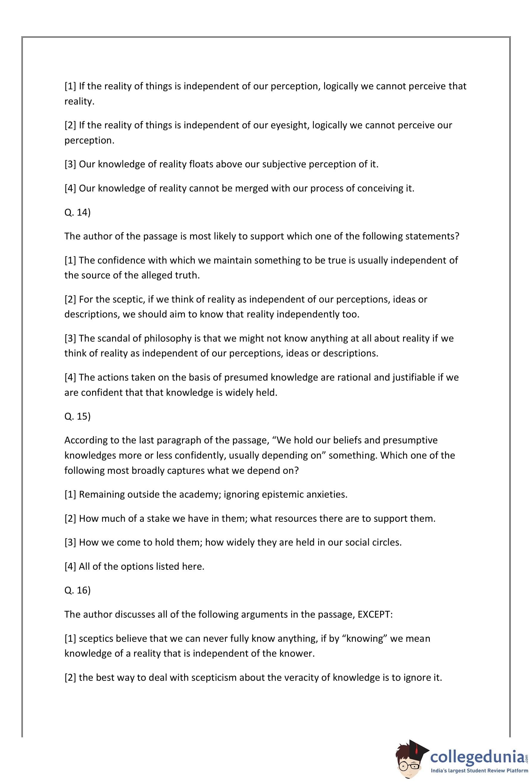 Thus, the correct option is: \[ \boxed{(1) If the reality of things is independent of our perception, logically we cannot perceive that reality.} \] Quick Tip: Pay attention to the relationship between perception and knowledge as discussed in the passage. If reality is outside our perception, we can't access it.