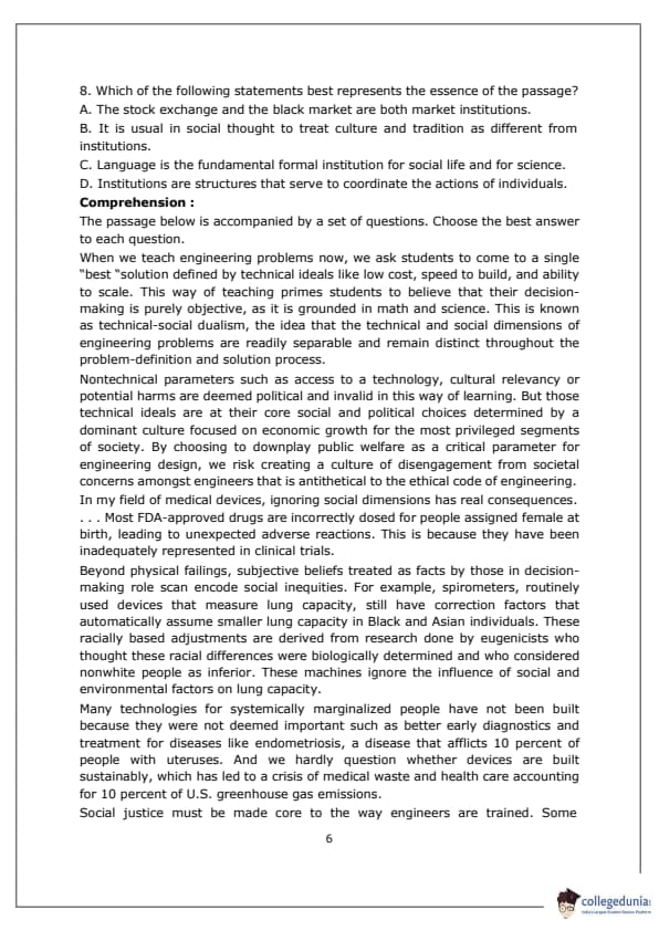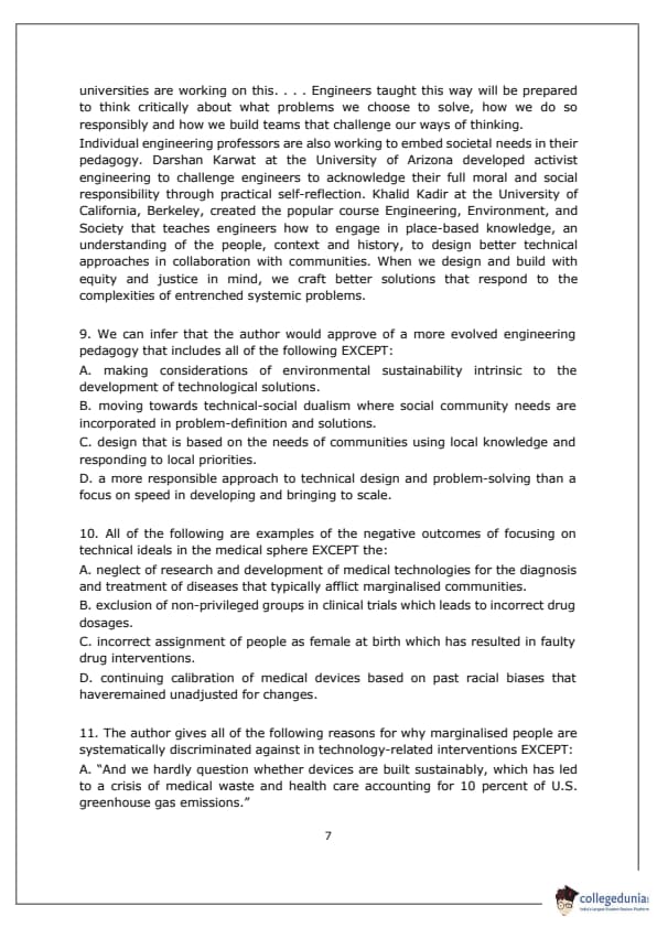 But those technical ideals are at their core social and political choices determined by a dominant culture focused on economic growth for the most privileged segments of society. By choosing to downplay public welfare as a critical parameter for engineering design, we risk creating a culture of disengagement from societal concerns amongst engineers that is antithetical to the ethical code of engineering. In my field of medical devices, ignoring social dimensions has real consequences. . . . Most FDA-approved drugs are incorrectly dosed for people assigned female at birth, leading to unexpected adverse reactions. This is because they have been inadequately represented in clinical trials. Beyond physical failings, subjective beliefs treated as facts by those in decision-making roles can encode social inequities. For example, spirometers, routinely used devices that measure lung capacity, still have correction factors that automatically assume smaller lung capacity in Black and Asian individuals. These racially based adjustments are derived from research done by eugenicists who thought these racial differences were biologically determined and who considered nonwhite people as inferior. These machines ignore the influence of social and environmental factors on lung capacity. Many technologies for systemically marginalized people have not been built because they were not deemed important, such as better early diagnostics and treatment for diseases like endometriosis, a disease that afflicts 10 percent of people with uteruses. And we hardly question whether devices are built sustainably, which has led to a crisis of medical waste and health care accounting for 10 percent of U.S. greenhouse gas emissions. Social justice must be made core to the way engineers are trained. Some universities are working on this. . . . Engineers taught this way will be prepared to think critically about what problems we choose to solve, how we do so responsibly, and how we build teams that challenge our ways of thinking. Individual engineering professors are also working to embed societal needs in their pedagogy. Darshan Karwat at the University of Arizona developed activist engineering to challenge engineers to acknowledge their full moral and social responsibility through practical self-reflection. Khalid Kadir at the University of California, Berkeley, created the popular course Engineering, Environment, and Society that teaches engineers how to engage in place-based knowledge, an understanding of the people, context, and history, to design better technical approaches in collaboration with communities. When we design and build with equity and justice in mind, we craft better solutions that respond to the complexities of entrenched systemic problems.We can infer that the author would approve of a more evolved engineering pedagogy that includes all of the following EXCEPT: