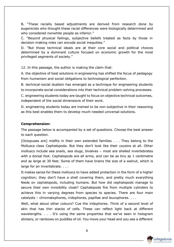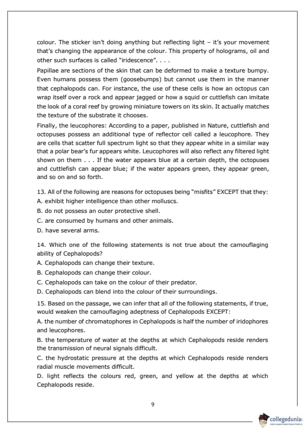 Based on the passage, we can infer that all of the following statements, if true, would weaken the camouflaging adeptness of Cephalopods EXCEPT: