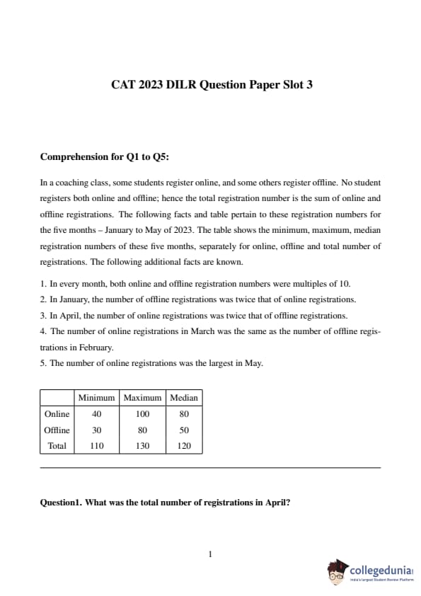 | 2 | What was the number of online registrations in January? | 40 | In January, the offline registrations were twice that of online (condition 2). Let online registrations be x; then offline = 2x. The total must fall within 110-130, so 3x = 120, giving x = 40. Thus, online registrations in January are 40. |