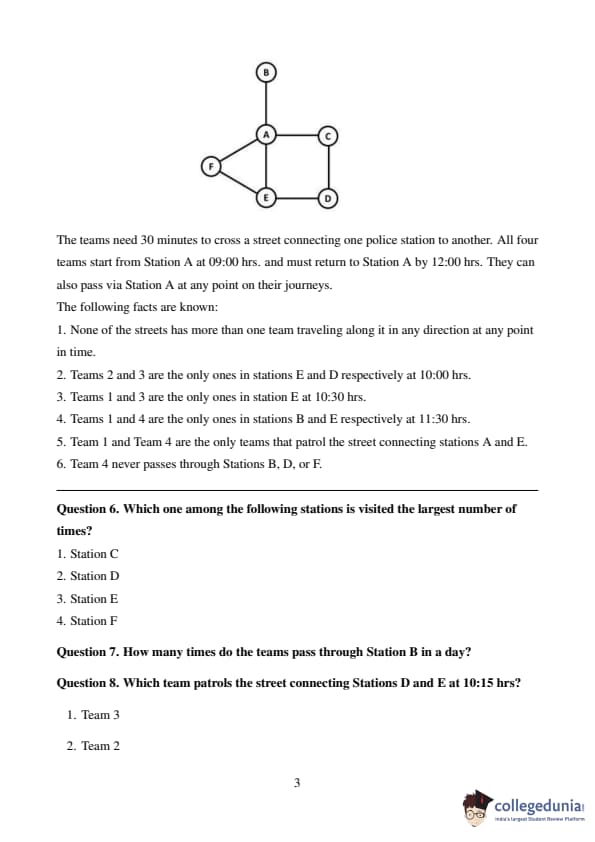 | 8 | Which team patrols the street connecting Stations D and E at 10:15 hrs? | 1. Team 3 | Since Team 3 is at Station D at 10:00 hrs and needs 30 mins to reach Station E, it is patrolling between D and E at 10:15 hrs. |