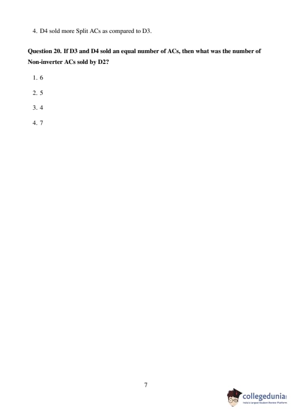 | 19 | Which of the following statements is necessarily false? 1. D1 and D3 together sold more ACs as compared to D2 and D4 together. 2. D2 sold the highest number of ACs. 3. D1 and D3 sold an equal number of Split ACs. 4. D4 sold more Split ACs as compared to D3. |