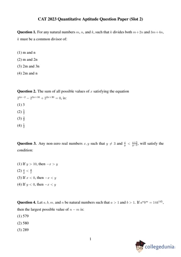 | 4 | If a^n * b^m = 144145, then the largest possible value of n − m is: 1. 579 2. 580 3. 289 4. 290 |