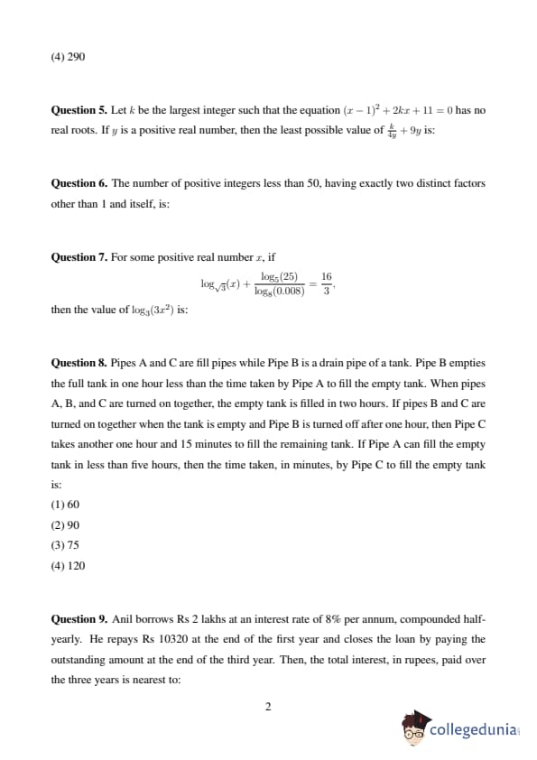 | 5 | Let k be the largest integer such that (x − 1)^2 + 2kx + 11 = 0 has no real roots. Then the least possible value of (k/4y + 9y) is: | 6 | To ensure no real roots, the discriminant must be less than zero. Solving the inequality for k, we find the largest integer satisfying this condition and use it to find the minimum of k/4y + 9y. |