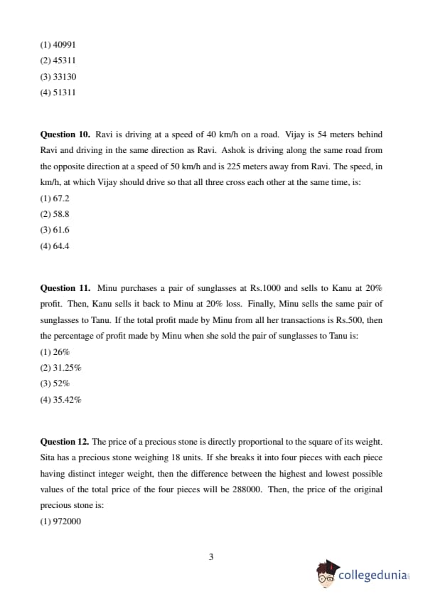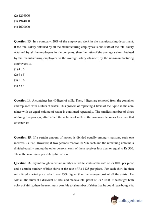 | 16 | Jayant buys white shirts at Rs 1000 each and blue shirts at Rs 1125. After selling all shirts with set profit, maximum total shirts bought: | 407 | Setting up profit equations, we determine the maximum number of shirts Jayant could buy to achieve his profit target. |