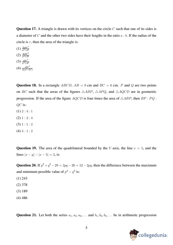 | 18 | In rectangle ABCD with AB = 9 cm, BC = 6 cm, points P and Q divide BC such that areas of △ABP, △APQ, and △AQCD are in geometric progression with AQCD = 4×ABP. BP:PQ:QC: | 2 : 4 : 1 | Setting up and solving for geometric progression in areas, we find the length ratios for BP, PQ, and QC. |