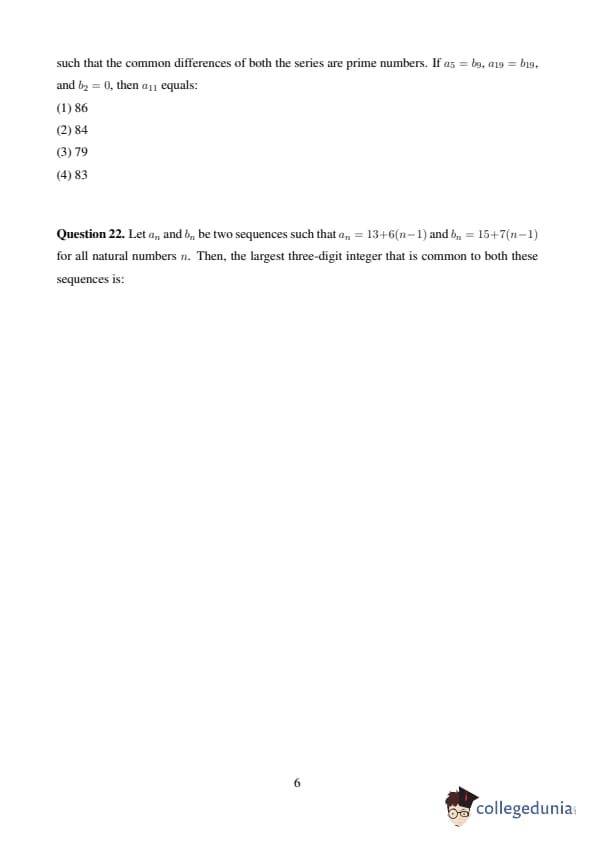 | 21 | Both sequences an and bn are in arithmetic progression. If a5 = b9, a19 = b19, b2 = 0, then a11 equals: | 79 | Using sequence formulas, we solve for common terms and find that a11 equals 79. |