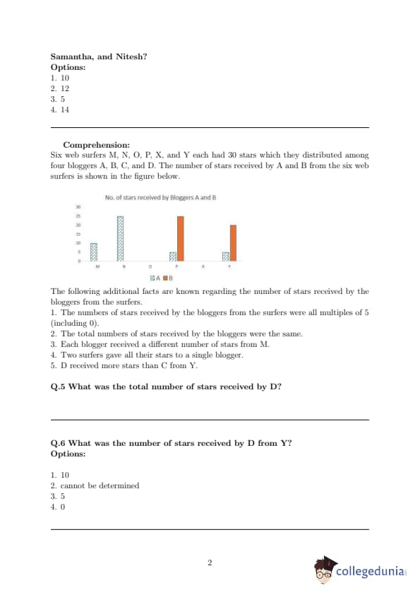 Six web surfers M, N, O, P, X, and Y each had 30 stars which they distributed among four bloggers A, B, C, and D. The number of stars received by A and B from the six web surfers is shown in the figure below.