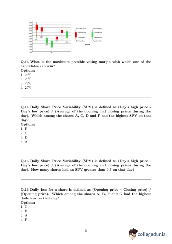 The chart below shows the price data for seven shares – A, B, C, D, E, F, and G as a candlestick plot for a particular day. The vertical axis shows the price of the share in rupees.
