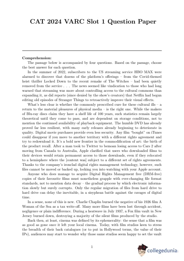 | CAT 2024 Slot 1 VARC Question Paper with Solutions PDF | Download PDF | Check Solutions |