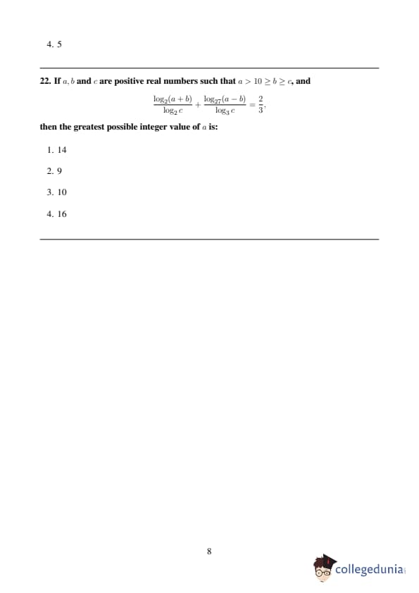(log base 2 of (a + b)) / (log base 2 of c) + (log base 27 of (a - b)) / (log base 3 of c) = 2/3, then the greatest possible integer value of a is: