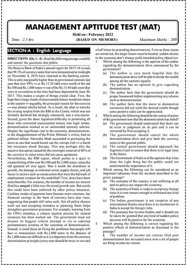 | MAT 2022 Question Paper with Solution PDF | Download | Check Solutions |