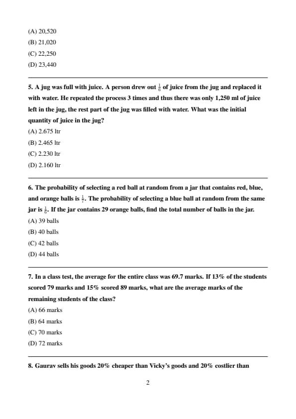 Thus, the initial quantity of juice in the jug was 2.465 liters. Quick Tip: In such problems, always keep track of the remaining fraction after each operation and multiply it with the previous quantity to get the final amount.