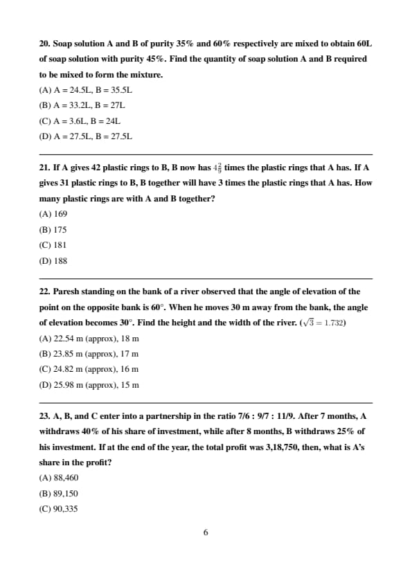 Thus, the required quantities are: \[ A = 24.5 \, L, \quad B = 35.5 \, L \] Quick Tip: When mixing solutions with different concentrations, use a system of equations to represent the total volume and the total amount of the substance, then solve for the required quantities.