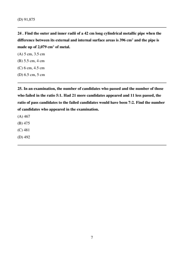 Thus, the outer radius is \( R = 6 \) cm, and the inner radius is \( r = 4.5 \) cm. Quick Tip: When solving problems involving cylindrical pipes, use the formula for the surface area and volume of a cylinder. Set up a system of equations to solve for the unknowns.