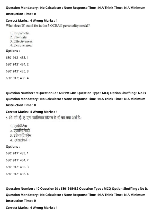 In the OCEAN personality model (also known as the Big Five personality traits), the letter E stands for Extroversion, which refers to how outgoing, energetic, and sociable a person is.