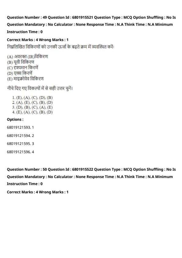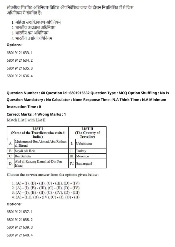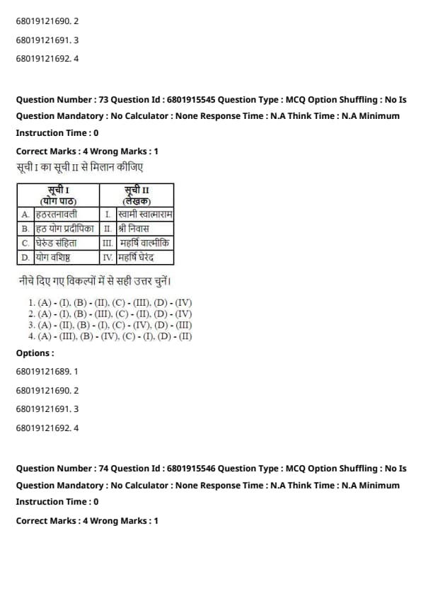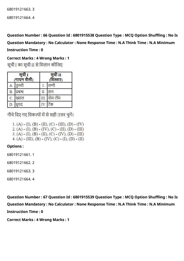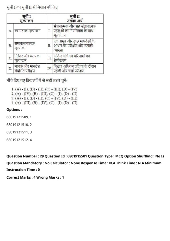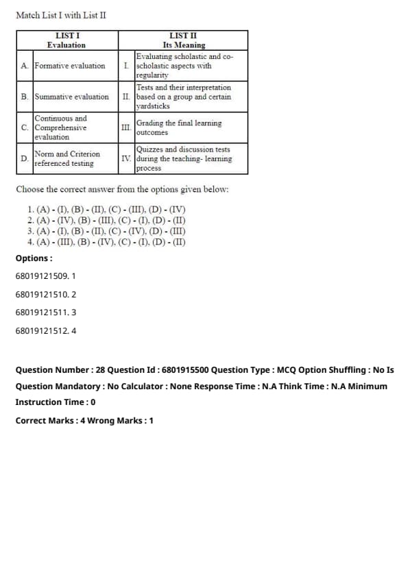 The correct answer is Option 2: (A) - (IV), (B) - (II), (C) - (III), (D) - (I).