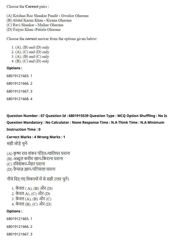 The correct answer is Option 4: (A) - Gwalior Gharana, (B) - Kirana Gharana, (C) - Maihar Gharana, (D) - Patiala Gharana.