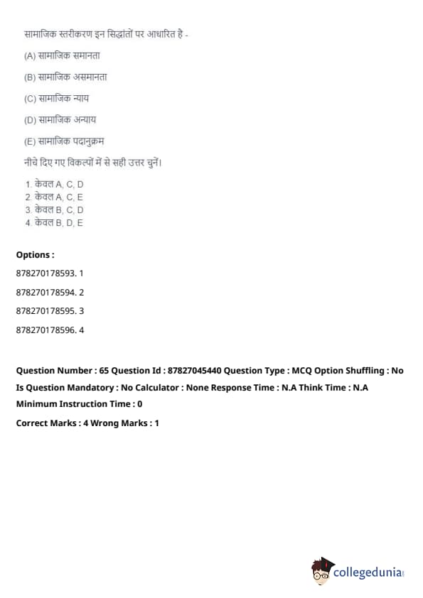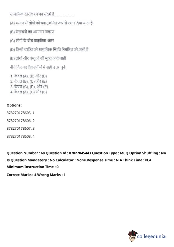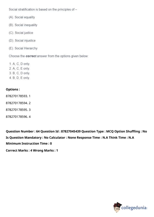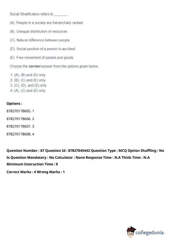 Thus, the correct answer is: (A), (B), and (D) only. Quick Tip: Social stratification is a system by which society ranks categories of people in a hierarchy. It impacts people's access to resources and opportunities, often leading to inequalities.