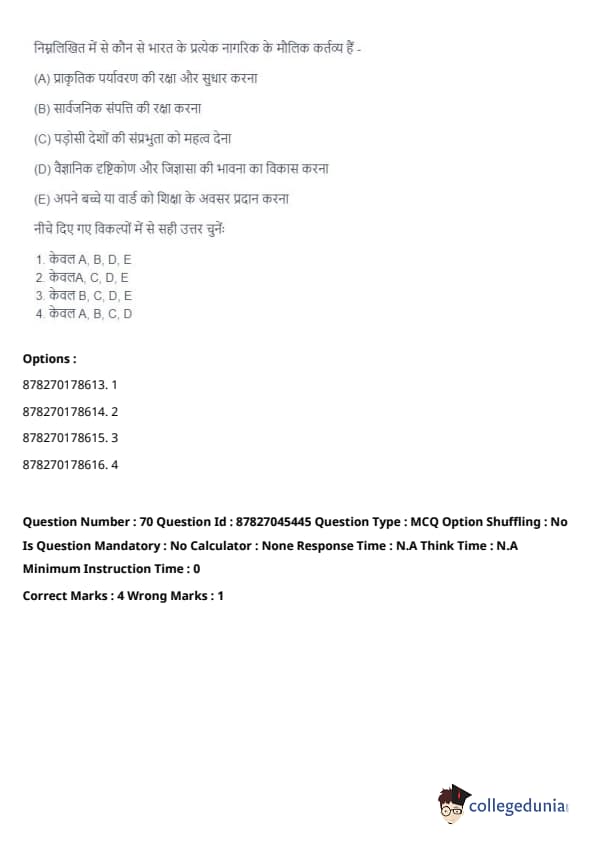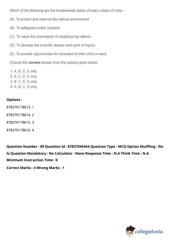 Thus, the correct answer is: (A), (B), (D), (E) only. Quick Tip: The Fundamental Duties in the Indian Constitution are guidelines for the citizens, which ensure their responsibilities towards the nation, society, and environment.