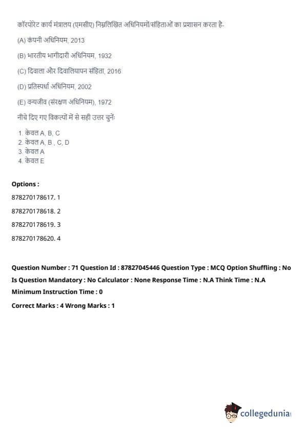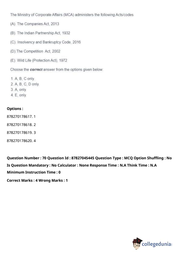 Thus, the correct answer is: (A), (B), (C), (D) only. Quick Tip: The Ministry of Corporate Affairs plays a crucial role in regulating the corporate sector, facilitating ease of doing business, and ensuring legal compliance.