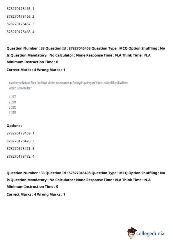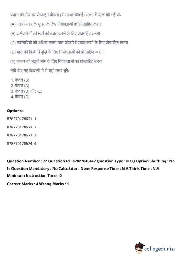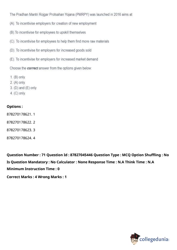 Thus, the correct answer is: (A) only. Quick Tip: PMRPY is aimed at promoting employment generation by incentivizing employers to hire new workers, especially from vulnerable and marginalized sections.