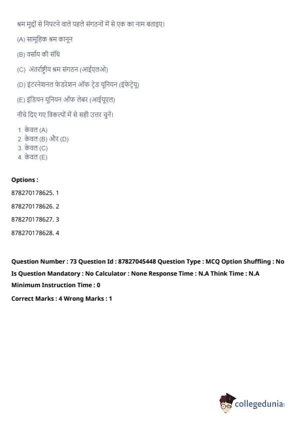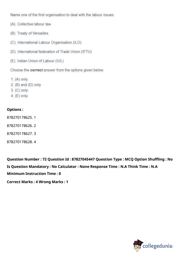 Thus, the correct answer is: (C) only. Quick Tip: The International Labour Organisation (ILO) has been at the forefront of advocating for workers' rights and has developed numerous international labor standards to protect workers globally.