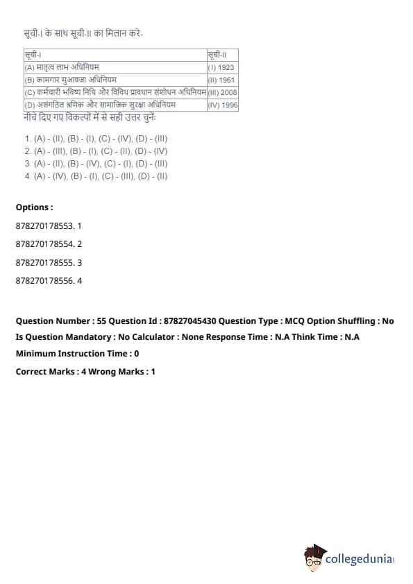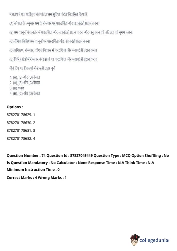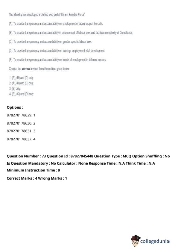 Thus, the correct answer is: (A), (B), and (D) only. Quick Tip: The Shram Suvidha Portal aims to streamline labor law compliance and improve transparency in the labor market, benefiting both employers and employees.