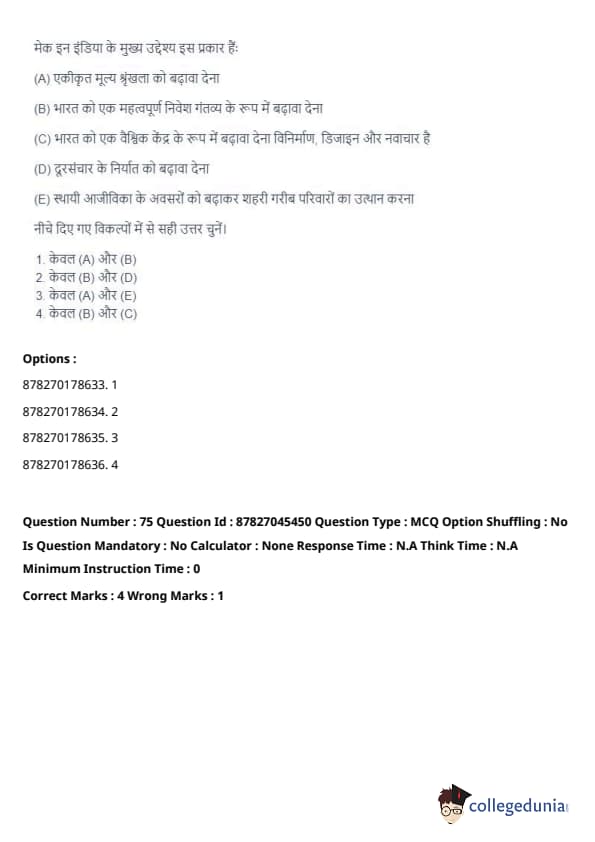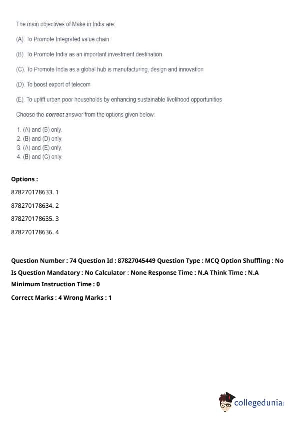 Thus, the correct answer is: (B) and (C) only. Quick Tip: Make in India aims to increase domestic manufacturing and innovation, fostering economic growth by enhancing India's position as a global manufacturing hub.