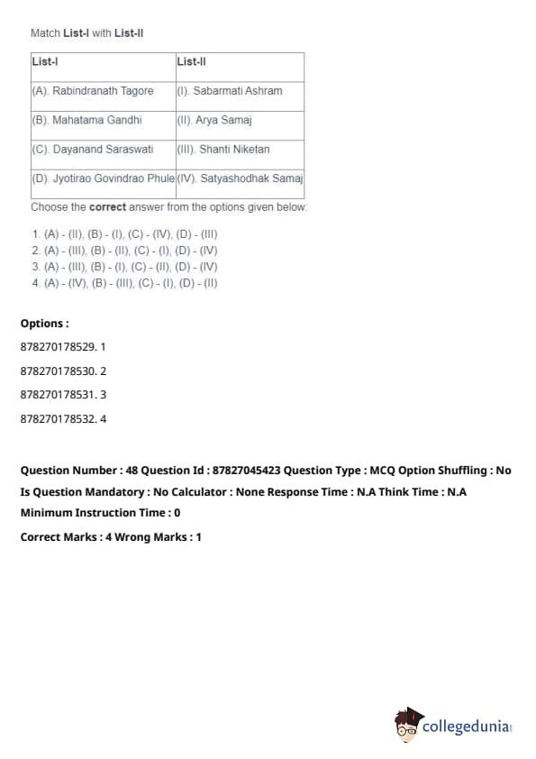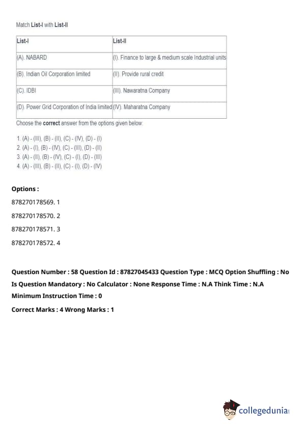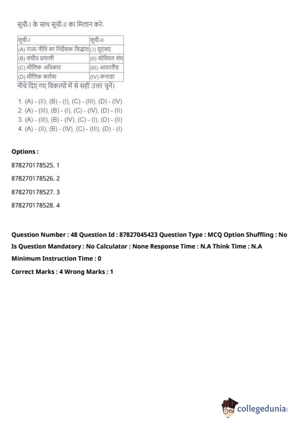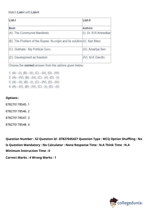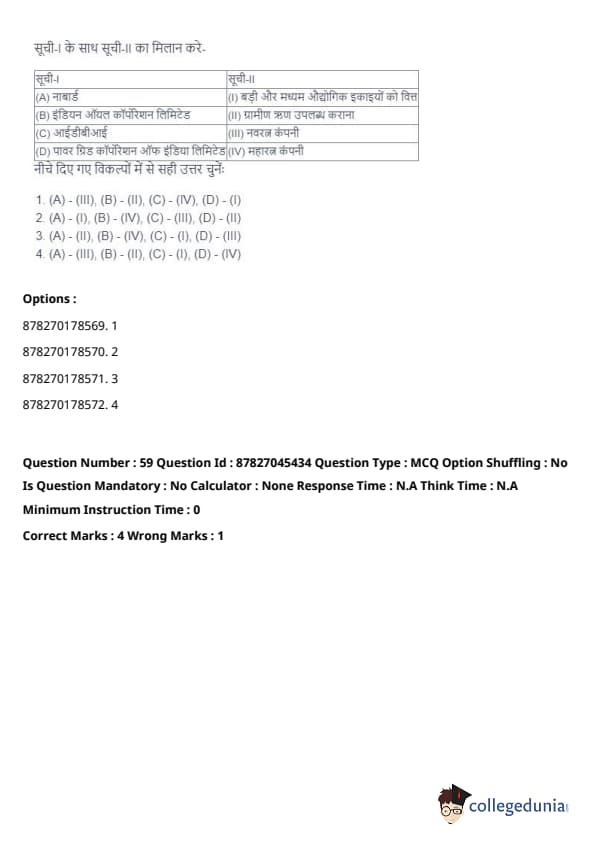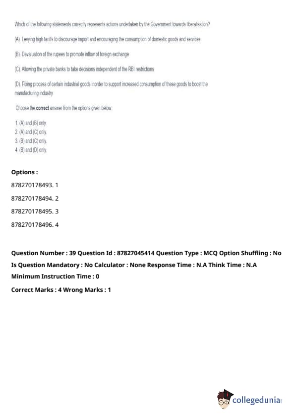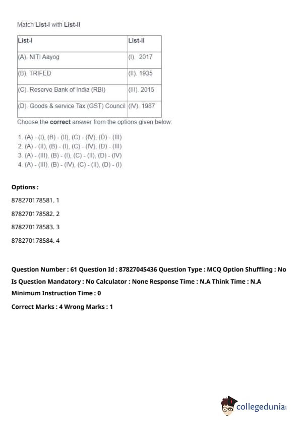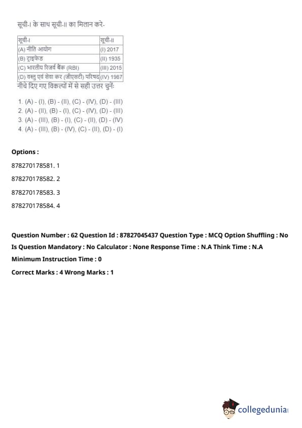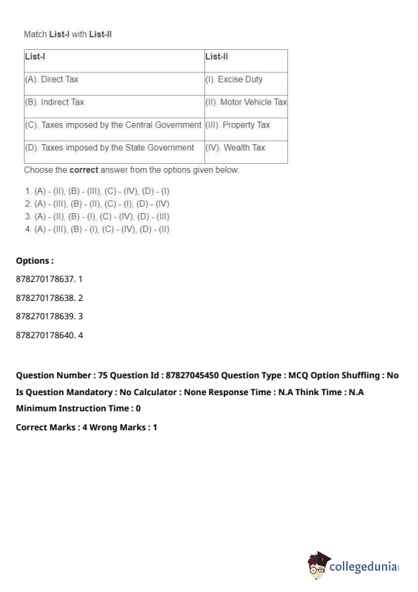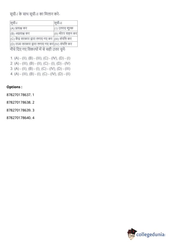 - (A) - (II), (B) - (I), (C) - (IV), (D) - (III). Quick Tip: Direct taxes are levied directly on individuals and organizations, while indirect taxes are passed on to the consumer through the price of goods and services. Understanding their distinctions is key in grasping tax structures.