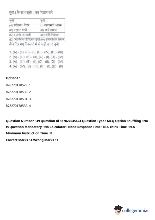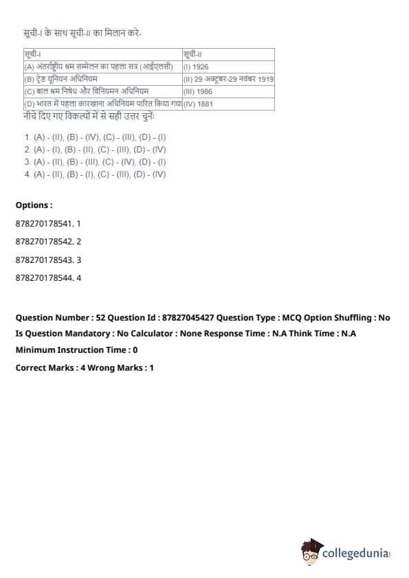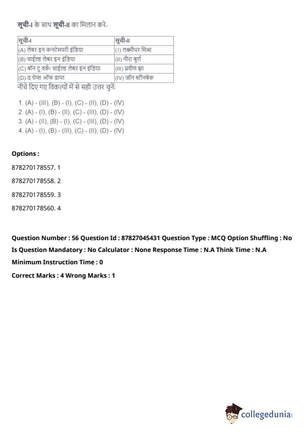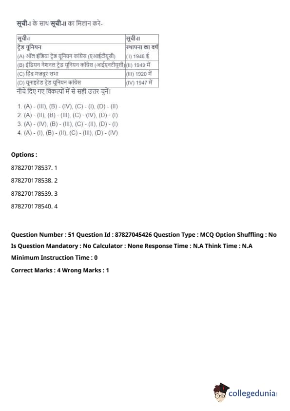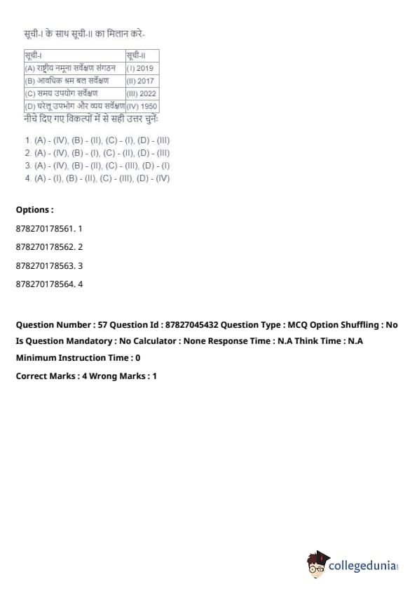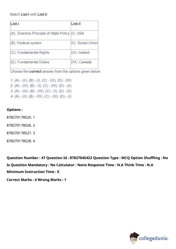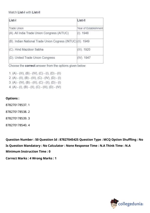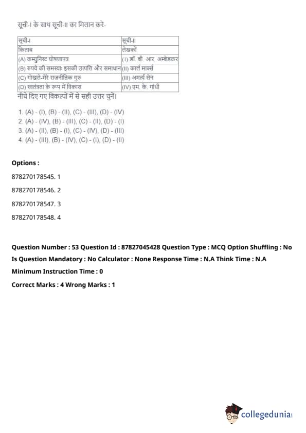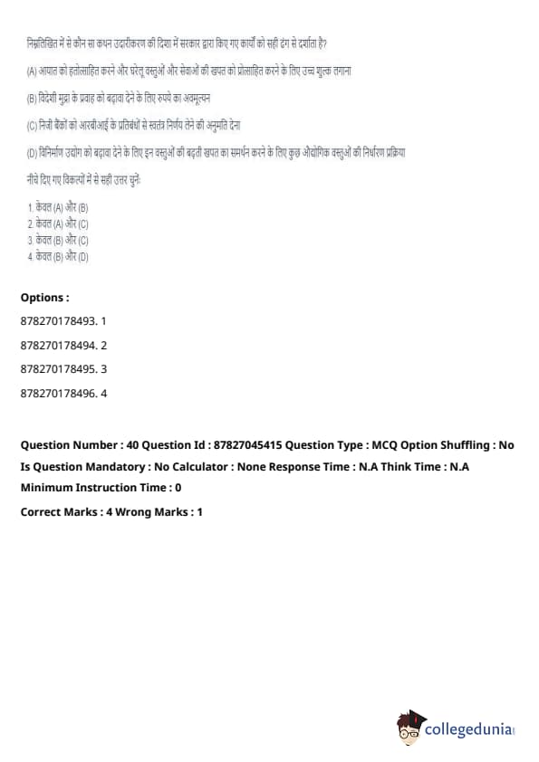 - (A) - (II), (B) - (I), (C) - (IV), (D) - (III). Quick Tip: Direct taxes are levied directly on individuals and organizations, while indirect taxes are passed on to the consumer through the price of goods and services. Understanding their distinctions is key in grasping tax structures.
