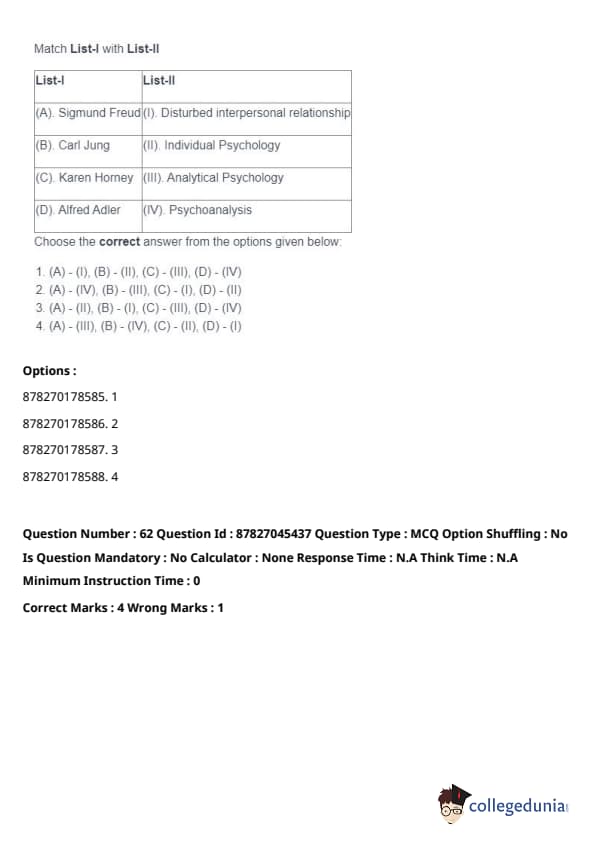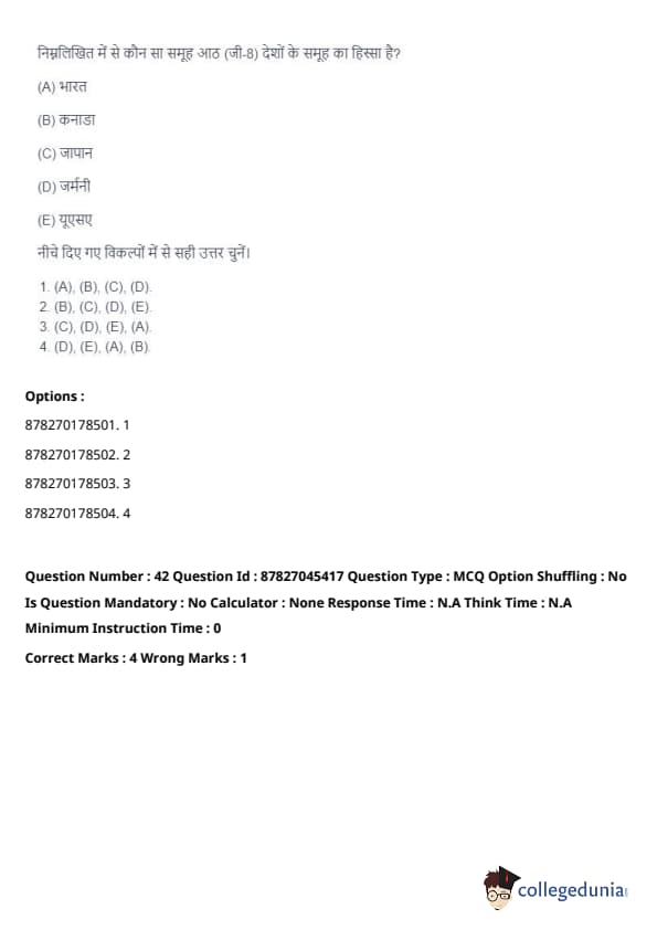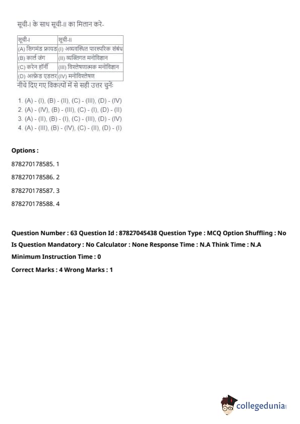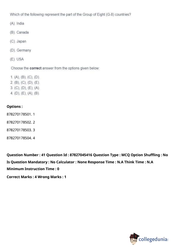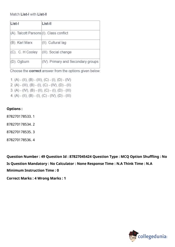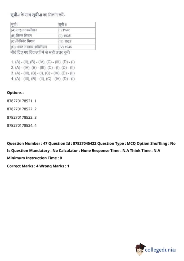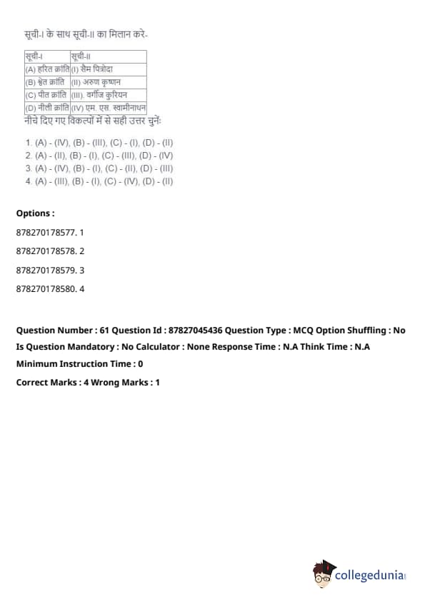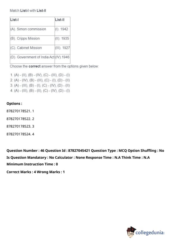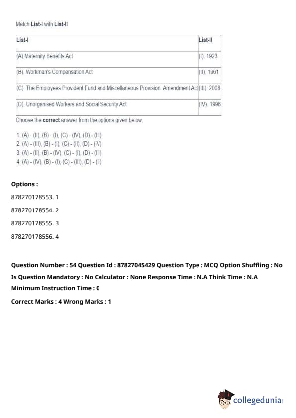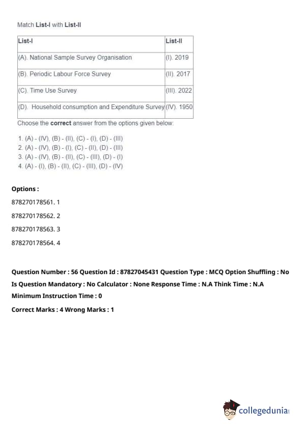 - (A) - (II), (B) - (I), (C) - (IV), (D) - (III). Quick Tip: Direct taxes are levied directly on individuals and organizations, while indirect taxes are passed on to the consumer through the price of goods and services. Understanding their distinctions is key in grasping tax structures.