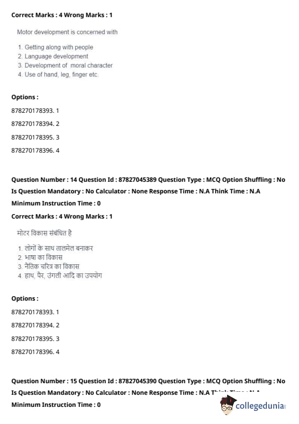 It is distinct from language development, moral development, and social aspects such as getting along with people, which are covered under different developmental areas. Quick Tip: Motor development is essential for children's physical growth and independence, and it plays a significant role in their overall well-being and coordination.