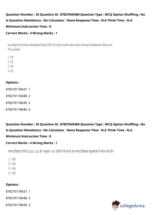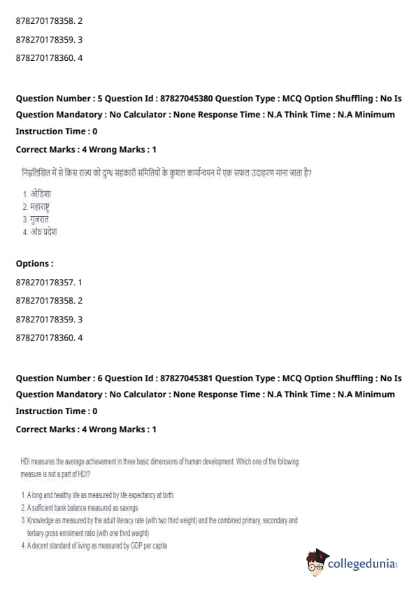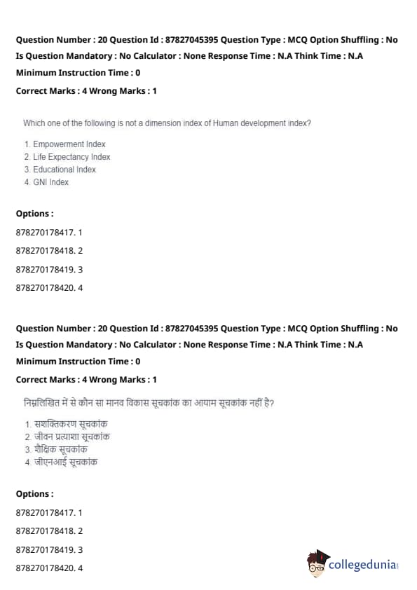 The Empowerment Index is not part of HDI. While it is a key factor in some development measures, it is not included in the HDI calculation. HDI focuses on health, education, and economic dimensions. Quick Tip: HDI is a comprehensive measure of development that emphasizes the well-being of individuals in terms of health, education, and standard of living, but it does not include direct measures of empowerment.