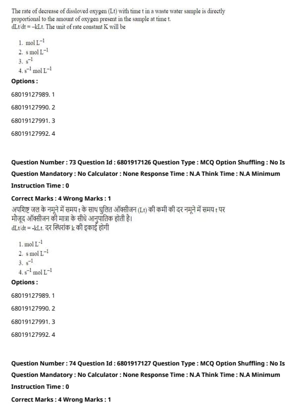 The rate of decrease of dissolved oxygen (Lt) with time t in a wastewater sample is directly proportional to the amount of oxygen present in the sample at time t. The unit of rate constant k will be: