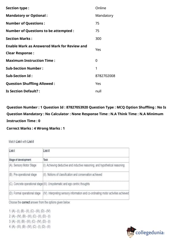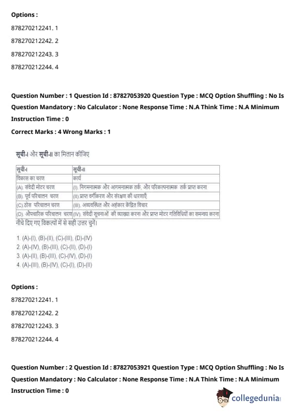 | (D) Formal Operational Stage | (IV) Interpreting sensory information and coordinating motor activities achieved |