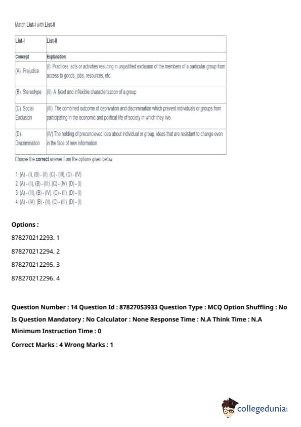 | (D) Discrimination | (IV) The holding of preconceived ideas about individuals or groups, resistant to change even with new information. |