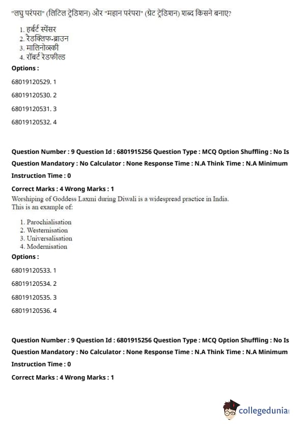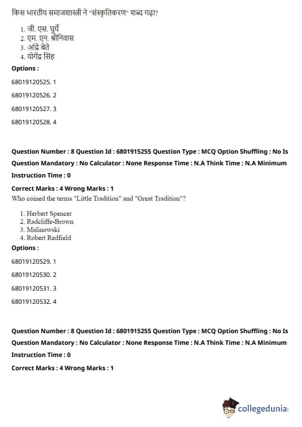 Radcliffe-Brown and Malinowski are both prominent anthropologists known for their work on structural-functionalism and fieldwork methods, respectively, but they did not coin these terms. Quick Tip: Redfield's concept of "Little Tradition" and "Great Tradition" highlights the distinction between formal, elite cultural practices and informal, everyday cultural traditions in society.
