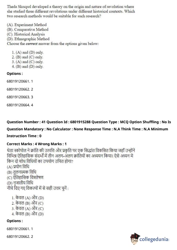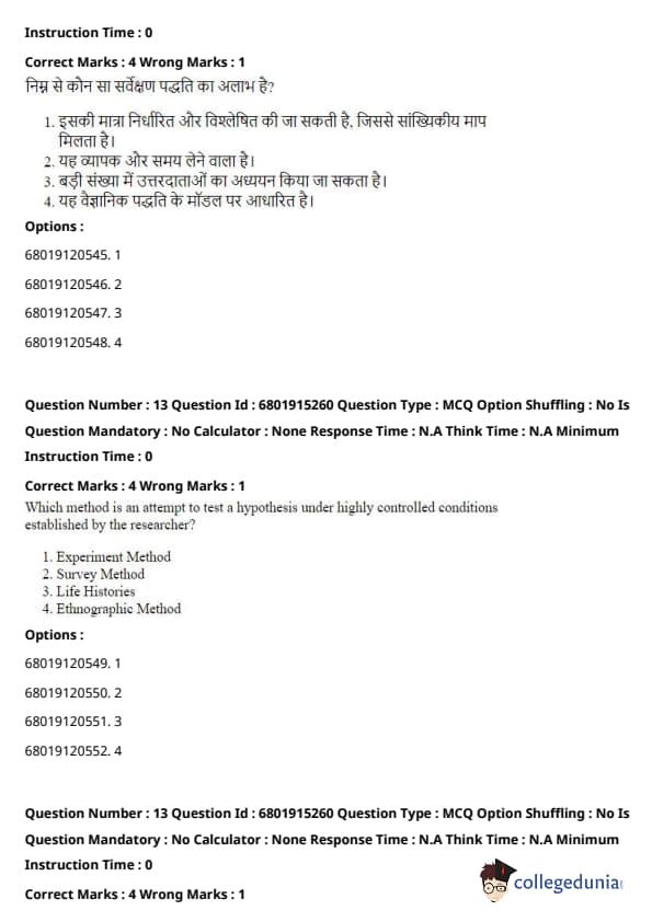In contrast, the other methods listed (Survey, Life Histories, and Ethnographic) involve less control over external factors and do not focus on testing causal relationships under controlled conditions. Quick Tip: Experimental research is powerful because it allows for causal inferences, but it requires rigorous control to avoid biases. Random assignment to groups is one way to achieve control.