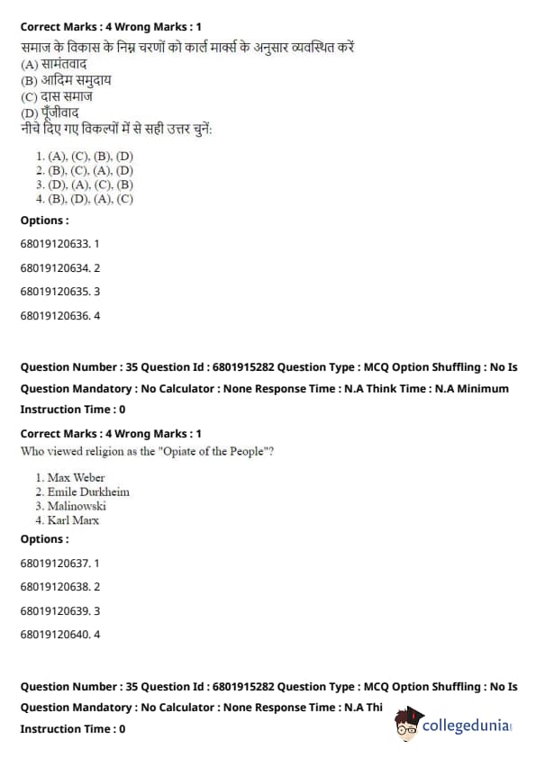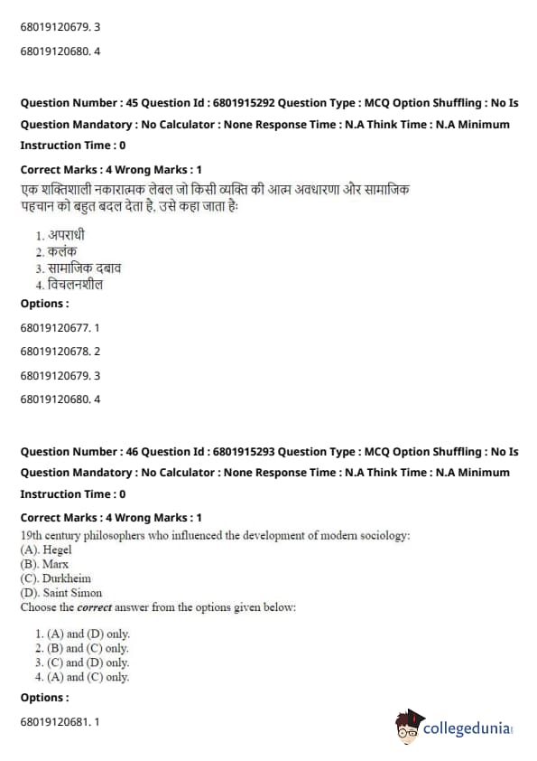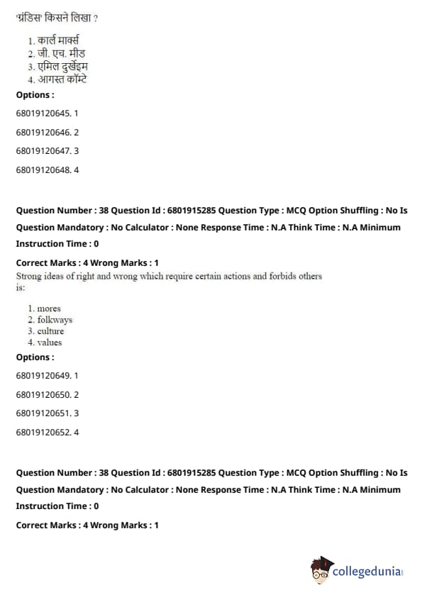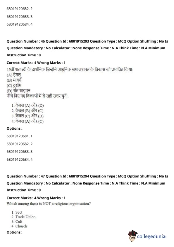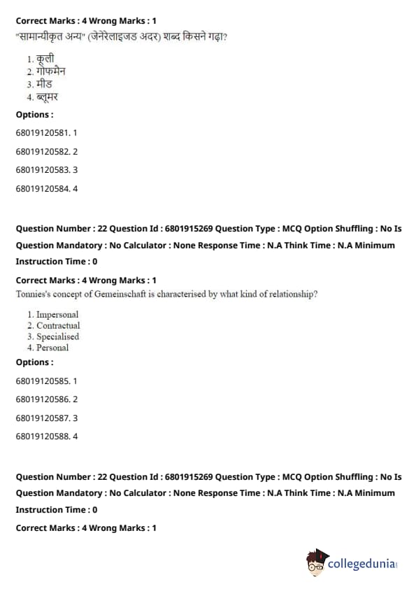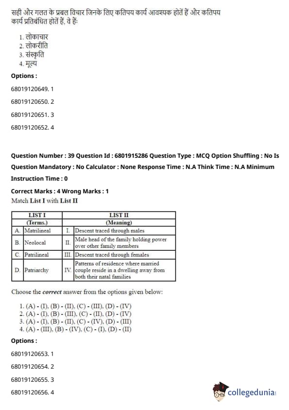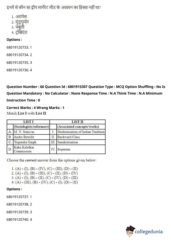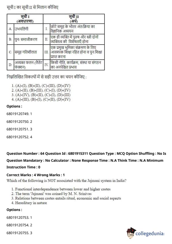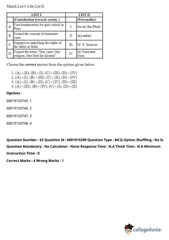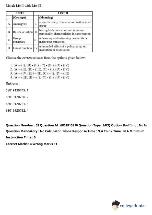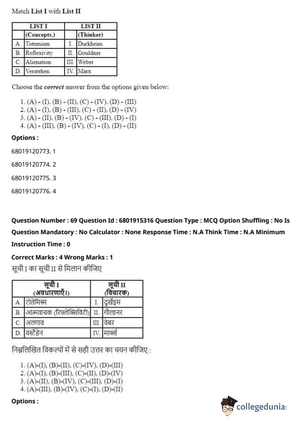 \[ (A) - (I), (B) - (III), (C) - (II), (D) - (IV) \] Quick Tip: These concepts are foundational to sociology, and understanding which thinker contributed to each one is essential for grasping their theories and contributions.