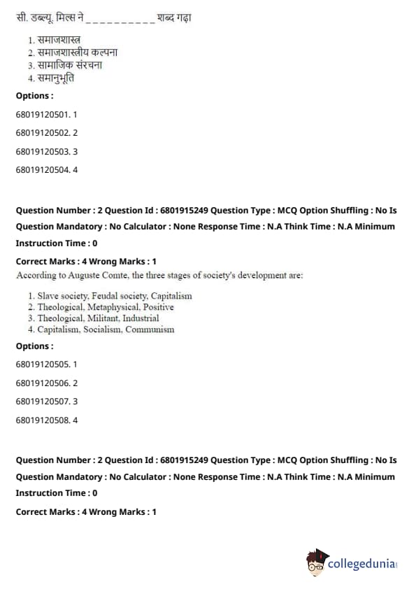Step 2: The correct answer is option (2) Theological, Metaphysical, Positive, as these are the three stages that Comte outlined in his work. The other options do not correspond to Comte’s theory of social evolution. Quick Tip: Comte’s theory of the three stages emphasizes how human thought evolves from a religious and metaphysical understanding of the world to a more scientific and empirical approach.
