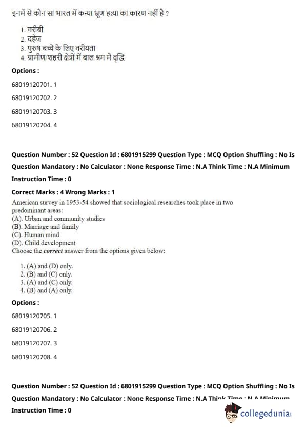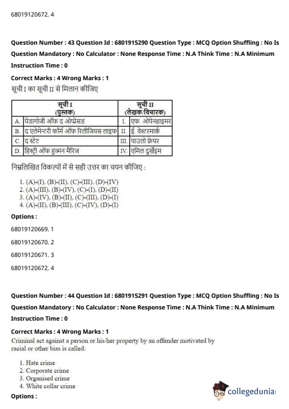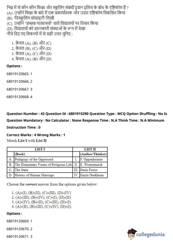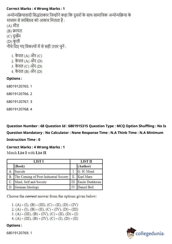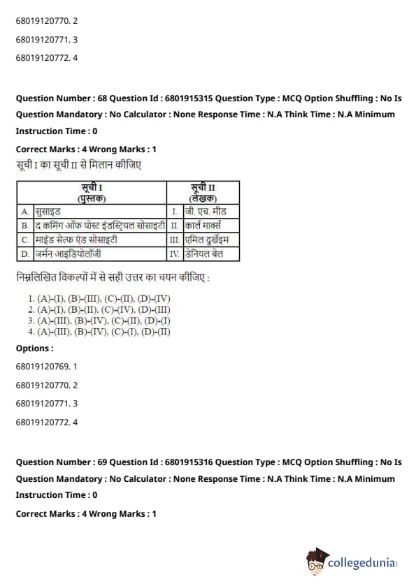 \[ (A) - (I), (B) - (III), (C) - (II), (D) - (IV) \] Quick Tip: Each of these works has had a significant influence on the development of sociological theory, providing foundational ideas that shaped the understanding of society and social behavior.