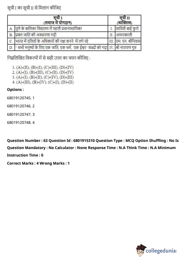 (D) Coined the terms "One caste, One religion, One God for all men" is Sri Narayana Guru (IV), a social reformer who promoted new values of spiritual freedom and social equality. Quick Tip: Understanding the contributions of these personalities to society provides insights into the social and cultural history of India, reflecting changes in education, caste systems, and religious beliefs.